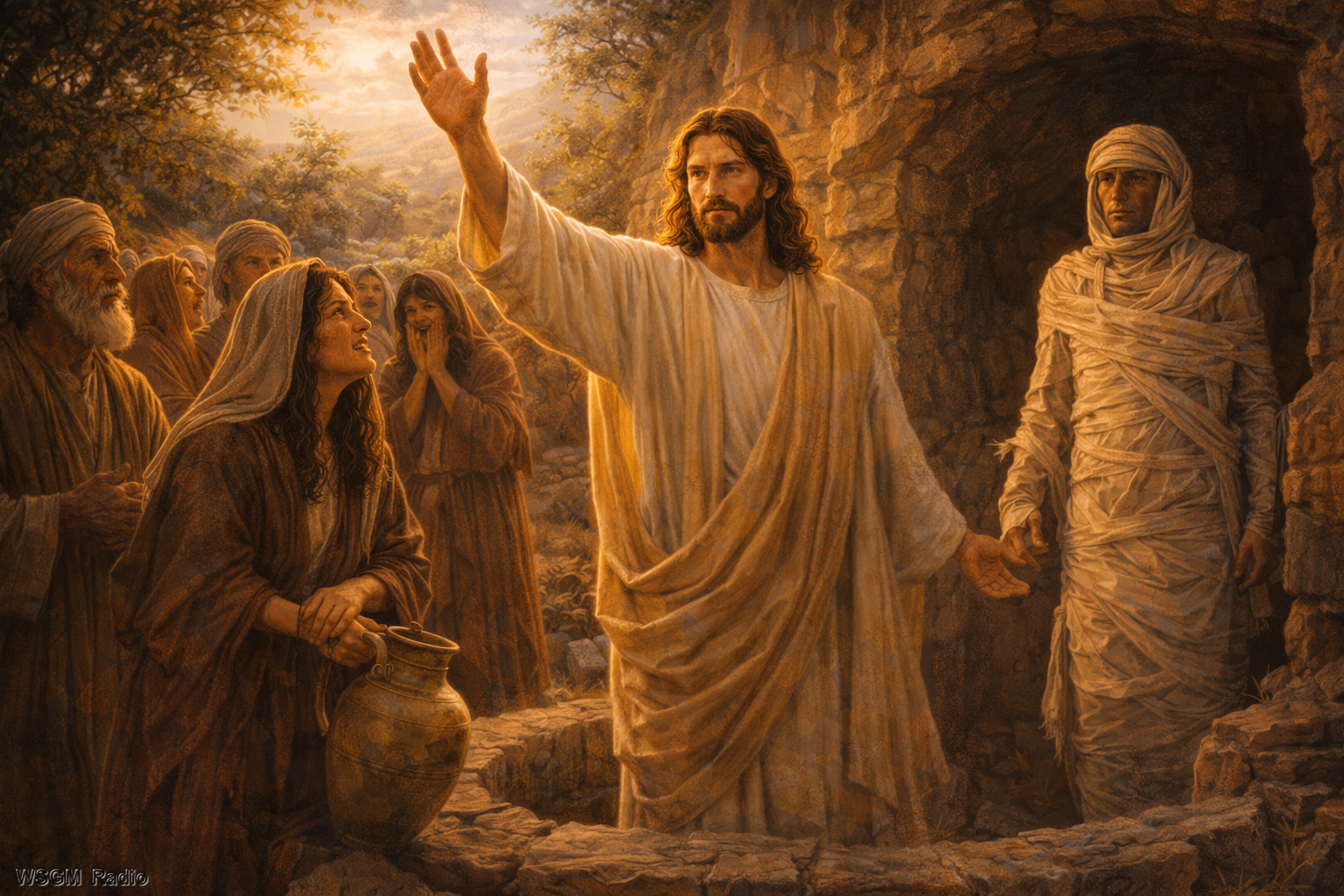 Then Jesus, again groaning in Himself, came to the tomb. It was a cave, and a stone lay against it. Jesus said, "Take away the stone." Martha, the sister of him who was dead, said to Him, "Lord, by this time there is a stench, for he has been dead four days." Jesus said to her, "Did I not say to you that if you would believe you would see the glory of God?" Then they took away the stone from the place where the dead man was lying. And Jesus lifted up His eyes and said, "Father, I thank You that You have heard Me. And I know that You always hear Me, but because of the people who are standing by I said this, that they may believe that You sent Me." Now when He had said these things, He cried with a loud voice, "Lazarus, come forth!" And he who had died came out bound hand and foot with graveclothes, and his face was wrapped with a cloth. Jesus said to them, "Loose him, and let him go." Then many of the Jews who had come to Mary, and had seen the things Jesus did, believed in Him. But some of them went away to the Pharisees and told them the things Jesus did. Then the chief priests and the Pharisees gathered a council and said, "What shall we do? For this Man works many signs. If we let Him alone like this, everyone will believe in Him, and the Romans will come and take away both our place and nation." And one of them, Caiaphas, being high priest that year, said to them, "You know nothing at all, nor do you consider that it is expedient for us that one man should die for the people, and not that the whole nation should perish." Now this he did not say on his own authority; but being high priest that year he prophesied that Jesus would die for the nation, and not for that nation only, but also that He would gather together in one the children of God who were scattered abroad.